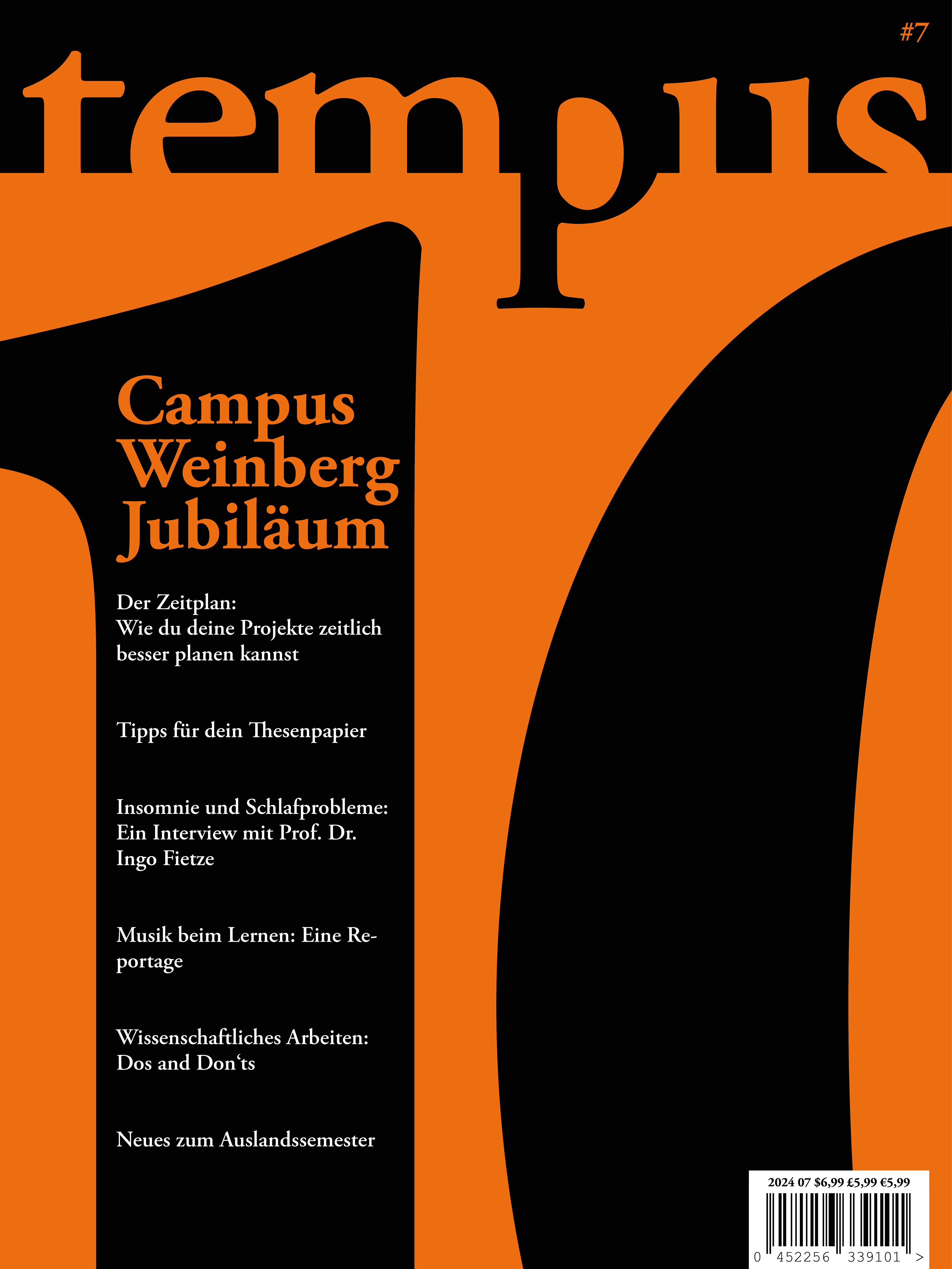 Bei dem tempus Magazin handelt es sich um ein fiktives Werk, das in dem Kurs Typo 2 im dritten Semester entstanden ist. Das Thema soll das zehnjährige Jubiläum vom Campus Weinberg in Hildesheim sein.